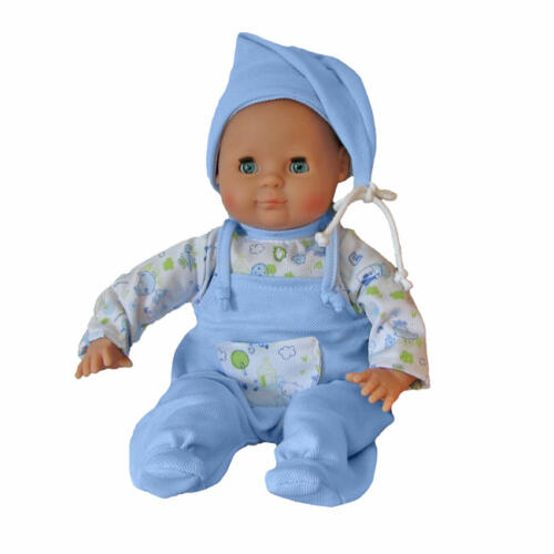 Die Schlummerle-Babypuppe ist 32 cm groß und hat blaue Schlafaugen. Die Puppe hat ein weißes Shirt und eine hellblaue Latzhose an. Auf dem Kopf trägt Schlummerle eine süße Zipfelmütze. Das Shirt ist mit kleinen Zeichnungen verziert. Auf der Latzhose ist eine große Tasche aufgenäht. Die Puppe hat einen weichen Stoffkörper. Der Kopf, die Arme und die Beine sind aus Vinyl. Die blauen Schlafaugen öffnen sich, wenn die Puppe hingestellt oder gesetzt wird, und schließen sich, wenn die Puppenmama die Puppe hinlegt.