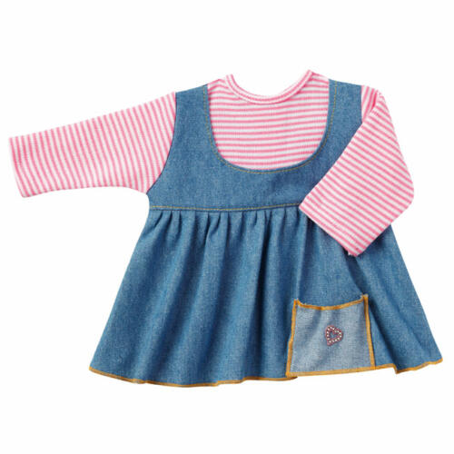Jeanskleid und Shirt passen Babypuppen, die 36 bis 40 cm groß sind. Das Shirt ist rosa gestreift und hat zum leichten An- und Ausziehen am Rücken einen Klettverschluss. Das Kleidchen ist am Saum mit einer kleinen Applikation verziert. Damit die Puppenmama Ihrer Puppe die hübschen Sachen bequem Anziehen kann, hat auch das Kleidchen einen praktischen Klettverschluss am Rücken.