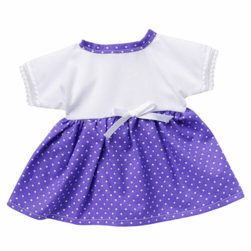 Das Puppenkleidchen passt Babypuppen, die 24 bis 26 cm groß sind. Es hat ein weißes Oberteil, das am Hals mit einem lilafarbenen Stoff eingesäumt ist. Der lilafarbene Rock hat ein Muster aus kleinen weißen Punkten. Damit die Puppenmama Ihre Puppe bequem an- und ausziehen kann, hat das Puppenkleidchen einen praktischen Klettverschluss am Rücken.